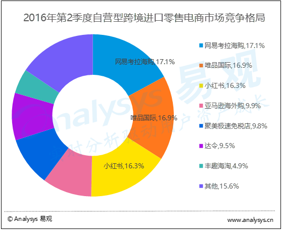 在自營(yíng)型跨境進(jìn)口零售電商中,相對(duì)平臺(tái)型而言較為分散,各廠商的競(jìng)爭(zhēng)更為激烈。網(wǎng)易考拉海購(gòu)以17.1%的份額排在第一位,唯品國(guó)際與小紅書(shū)分別以16.9%和16.3%的份額排在第二、第三位。市場(chǎng)中前三位占據(jù)剛好過(guò)半的份額,處于第一梯隊(duì),相對(duì)于其他廠商而言,有較明顯的領(lǐng)先優(yōu)勢(shì)。亞馬遜海外購(gòu)、聚美極速免稅店、達(dá)令的市場(chǎng)份額較為接近,處于第二梯隊(duì)。
